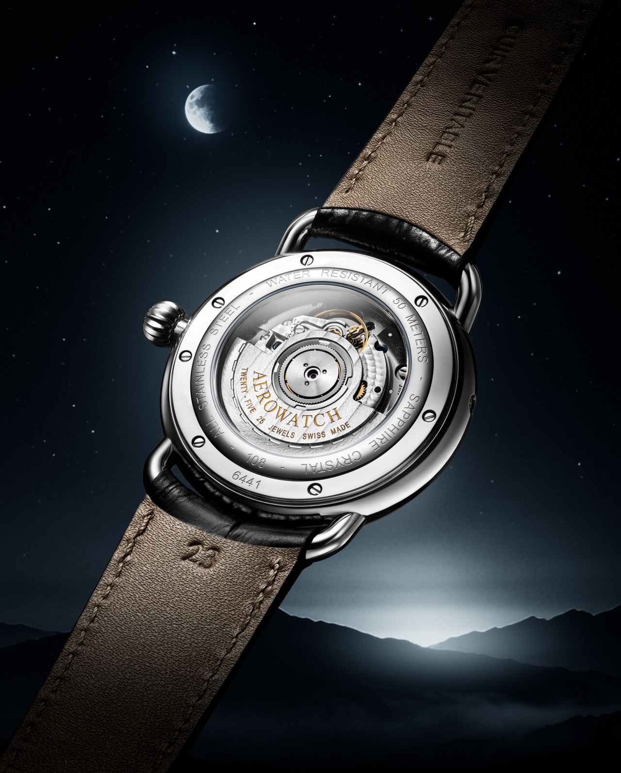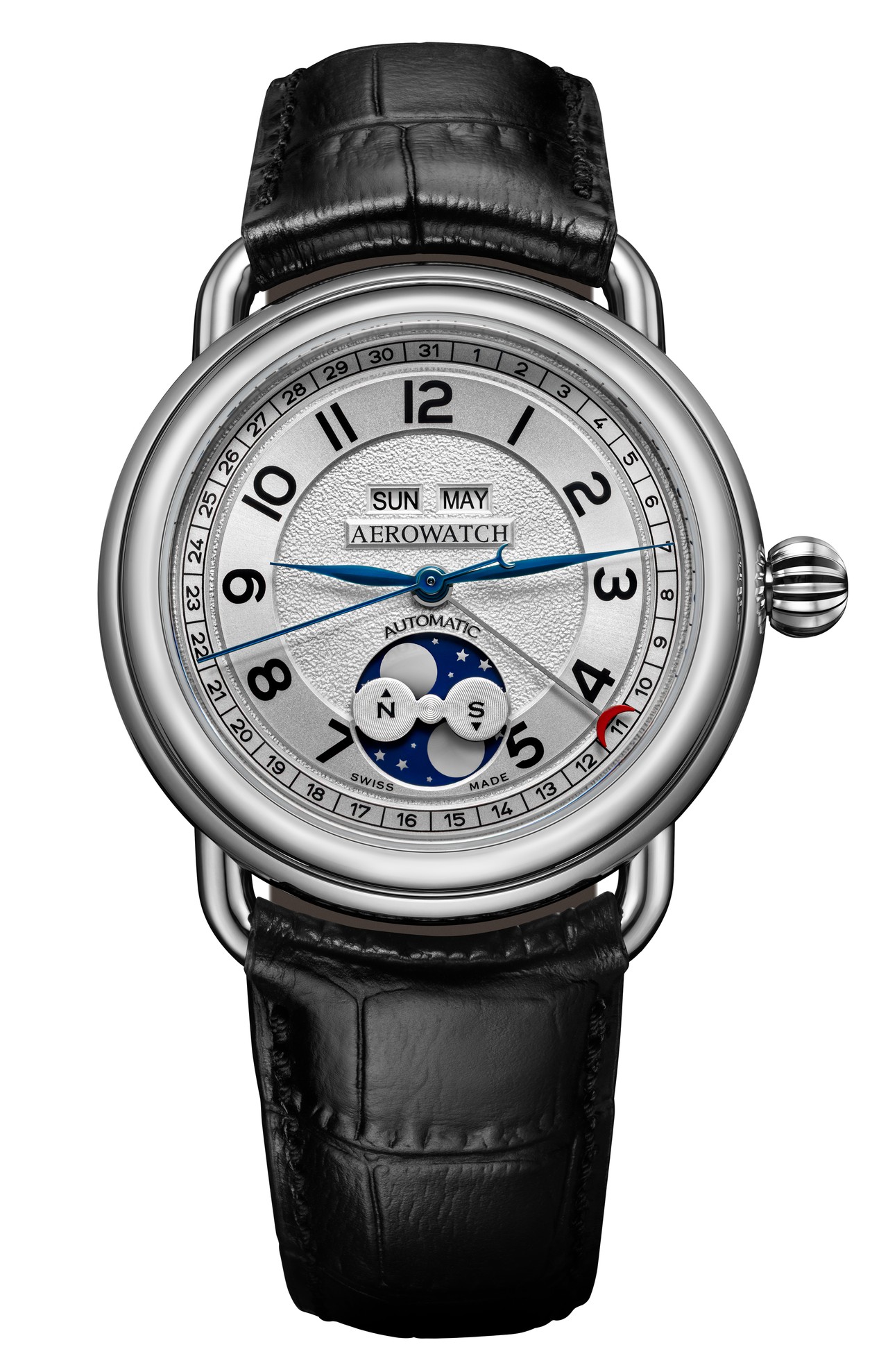 A teljes naptár – a nap, a dátum és a hónap együttes kijelzése – az egyik legpraktikusabb klasszikus komplikáció. Nem igényel bonyolult beállítást, mégis jóval többet nyújt egy egyszerű dátumablaknál. Az Aerowatch ezt a konstrukciót egészíti ki egy olyan holdfázis-megjelenítéssel, amely az északi és a déli féltekén is egyszerre követhetővé teszi a Hold ciklusát.
