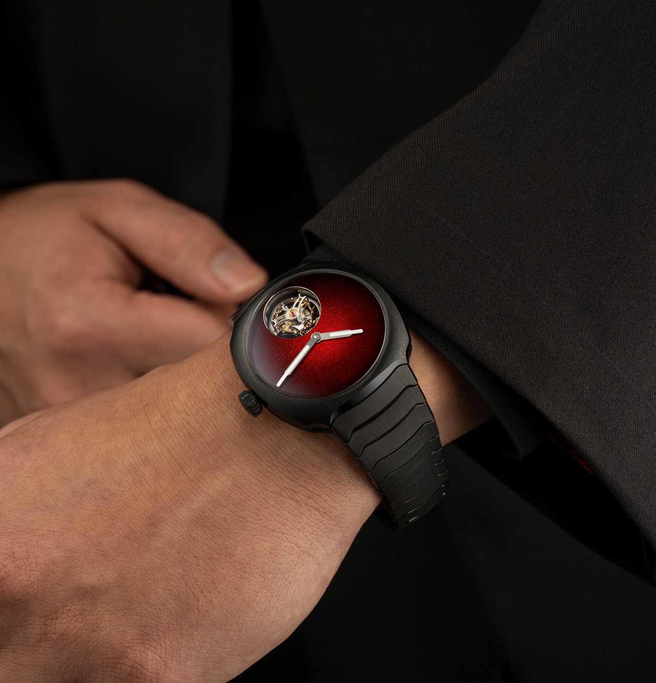 A több rétegben készülő zománc eredmény mély, fényre reagáló vörös tónus, amely kontrasztot alkot az antracit kerámiával. A számlapot csak a 6 óránál elhelyezett egyperces repülő tourbillon töri meg.