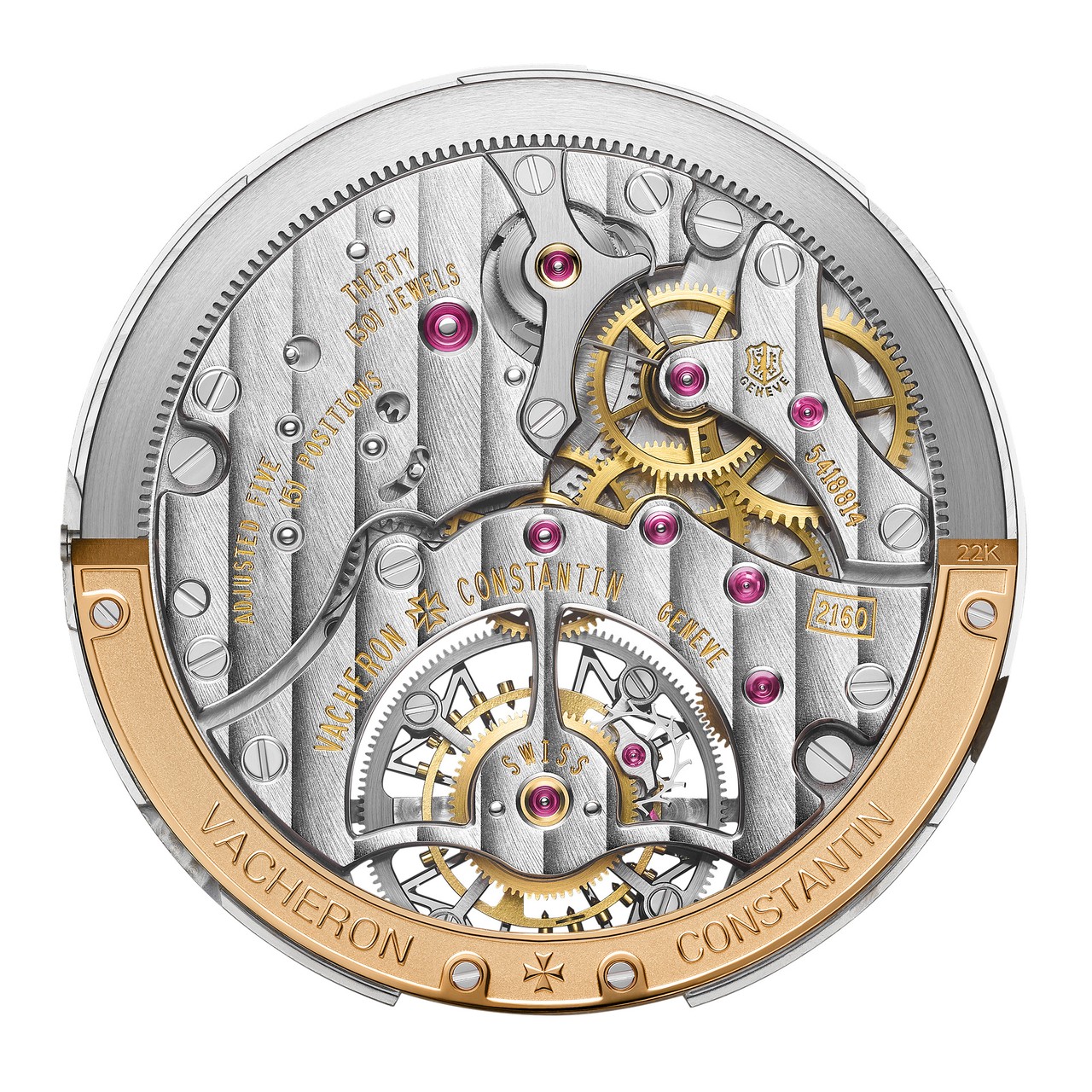 Kifejezetten látványos a óra manufaktúra kalibere, az automata 2160-as. A tourbillon miatt viszonylag magas a maga 5,65 milliméterével. Az igazi látványosság azonban az, amit alig látunk: perifériás rotor. Ennek köszönhető, hogy nem lett még magasabb a szerkezet és ezzel vastagabb a tok, illetve teljesen szabad a belátás. Nem utolsósorban pedig mind a mai napig igazi ritkaságnak számít az ilyen felhúzás. A szerkezet 80 órás járástartalékkal rendelkezik, ami egy automata tourbillontól szép teljesítmény. Nyilván a Genfi Pecsét tanúsítvány sem maradhatott ki, ami szint minden komolyabb vagy klasszikus darabnál alap a márkánál, de persze van kivétel. (Például az összes Fiftysix modell.)Vacheron Constantin Overseas Tourbillon tourbillon detail